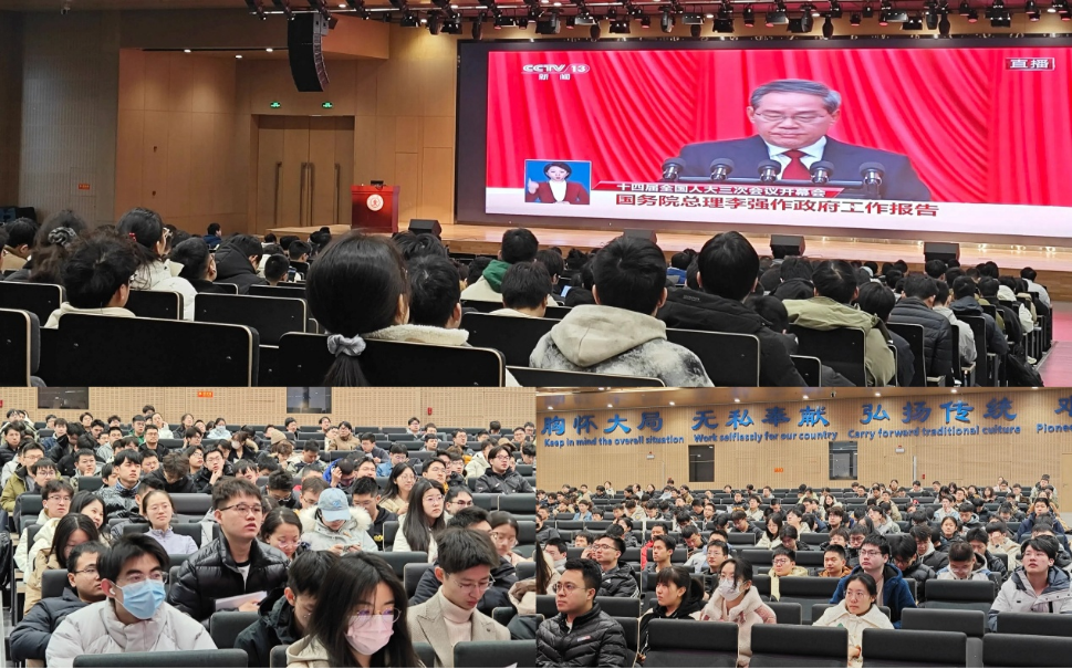 3月5日上午9点,麻豆在线 在涵英楼5-2E201千人报告厅组织开展“聆听两会声音,践行青年担当”主题教育活动,300余名硕博研究生集中观看第十四届全国人大三次会议开幕会直播,同步学习政府工作报告,沉浸式感悟国家发展脉动。 聚焦盛会:沉浸式学习国家发展蓝图会议期间,与会同学认真聆听国务院总理李强所作的政府工作报告。报告聚焦科技创新、教育改革、绿色发展等国家战略,明确提出“加快发展新质生...