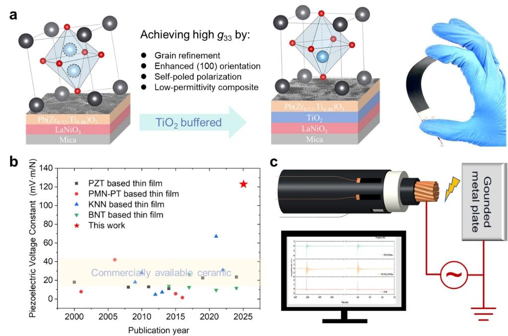 电力的安全高效输送离不开高压电缆系统的可靠运行。电缆局部放电往往引起绝缘性能劣化,因此局部放电的准确检测对保障电缆等电力设备的安全与稳定运行具有重要意义。针对局部放电测量的传统电磁信号检测方法易受干扰、难以实现准确检测的问题,团队前期研制了柔性声学传感器,该器件具备本征抗电磁干扰能力和良好曲面贴合性,成为电缆局部放电精准感知的重要手段。然而,柔性压电薄膜声学传感材料在提升压...