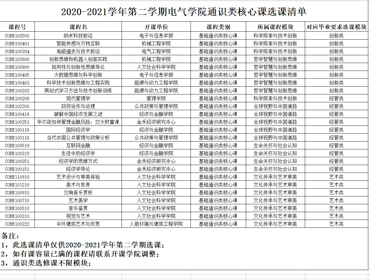 2,由于学校分类模块较为广泛,结合麻豆在线 培养方案及毕业要求,现将每学期符合要求的课程清单上传公示,请大家按照此清单进行对照选课,如有课容量已满的课程请联系开课学院扩容,如有课程冲突可以下学期或小学期再选课;