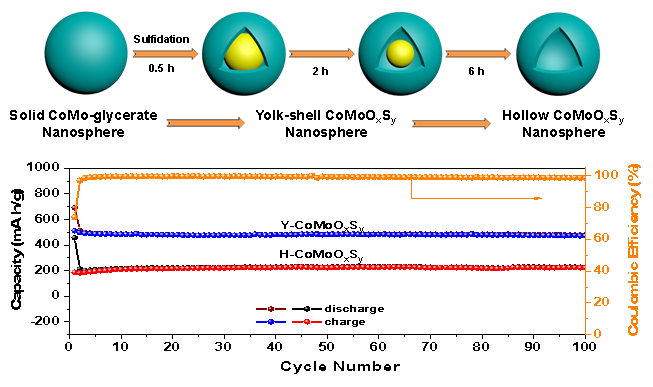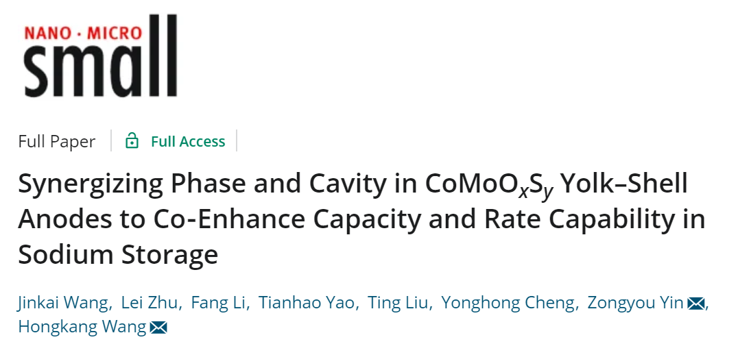 此外,针对硫化物负极材料在嵌脱钠过程中体积变化所导致的结构应力和电极破碎失效问题,课题组以钴钼-甘油实心球为前驱体,通过控制水热硫化时间,实现了CoMoOxSy核壳中空结构到CoMoSy空心球结构的有效调控,发现核壳结构可以有效缓解电极材料在嵌钠/脱钠过程中的体积膨胀/收缩,从而提高材料的结构稳定性。该研究工作以“Synergizing Phase and Cavity in CoMoOxSyYolk–Shell Anodes to Co‐Enhance Capacity and Rate Capability in Sodium Storage(物相/腔体协同调控增强CoMoOxSy核壳结构负极储钠容量和倍率性能)”为题发表在材料领域top期刊Small (影响因子11.459)。论文第一作者为电气学院博士生王金凯,通讯作者为电气学院王红康副教授和澳大利亚国立大学的殷宗友副教。