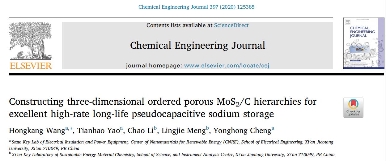 王红康副教授课题组采用模板结合纳米铸造(Nanocasting) 的方法,成功设计并构筑了由超薄MoS2/C中空/多孔球相互交联形成的三维等级结构。借助模板剂(均一氧化硅球)的引入并去除,实现了电极材料的三维多孔等级构筑,避免了材料堆叠团聚,提高了电解液-电极界面接触性能。碳源的引入,使得MoS2(002)晶面层间距显著增加,同时提高了材料的结构稳定性和导电性。作为钠离子电池材料,该电极实现了结构稳定性、导电性和界面接触性能的有机结合,表现出了优异的储钠容量、循环稳定性和高倍率性能,在2A/g大电流密度下循环500圈容量仍能保持412mAh/g(高于锂电池石墨负极的理论比容量372mAh/g),甚至在10、20和50A/g大电流密度下循环5000圈,容量仍能分别保持在156、128和76mAh/g(目前常用钠电正极Na3V2(PO4)3和NaFePO4的理论分别为~118和154mAh/g)。该材料表现出了优异的赝电容储钠性能,对于开发兼具高能量密度和高功率密度的赝电容储能设备(如钠离子电容器)具有重要的指导意义。该研究工作以“Constructing Three-Dimensional Ordered Porous MoS2/C Hierarchies for Excellent High-Rate Long-Life Pseudocapacitive Sodium Storage(构筑三维有序多孔MoS2/C等级结构实现优异高倍率长寿面赝电容储钠性能)”为题,发表在国际化学工程领域top期刊Chemical Engineering Journal (化学工程,影响因子10.652),麻豆在线