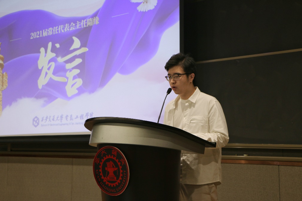 2021届常代会主任隋缘发言,对常代会的架构和基本职能进行了简要的介绍,并指出电气学院研究生常任代表会始终坚持从同学中来,到同学中去,如实反映同学心声,竭力维护同学正当权益,坚持为同学服务的宗旨。其次他对新同学们提出了四点目标和期望,作为电气学院第一届常代会成员,必须勇于承担起“拓荒者”角色,第一要准确把握自身定位,高效高质量完成自身工作;第二要加强组织内部建设,积极探索创新常代会发展方向;第三要明确常代会职能,全心全意为同学服务;第四要发挥桥梁纽带作用,做好学院党委团工委助手。最后隋缘同学表示,在今后的工作中,全体电气常代会成员将凝心聚力,确保各项工作有序高效高质量的开展,更好地服务广大同学,为学院发展贡献出自己的力量。