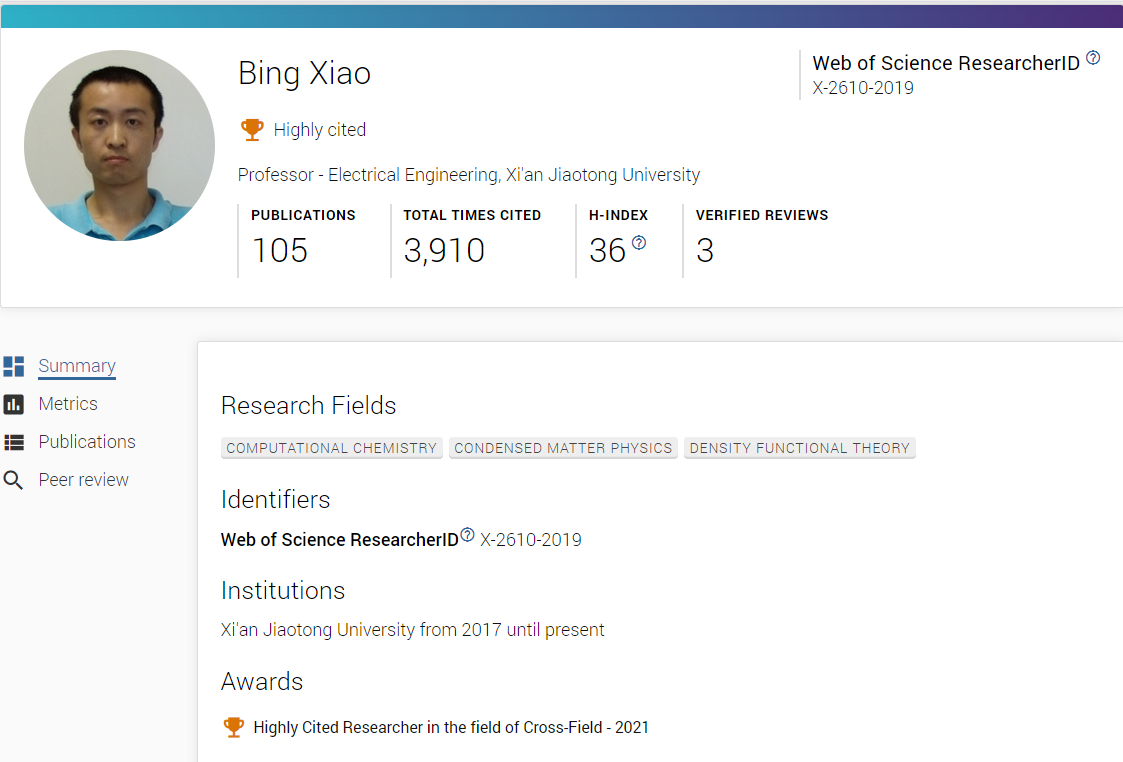 11月16日,肖冰教授入选科睿唯安(Clarivate Analytics) 2021年交叉学科“全球高被引科学家”名单,标志着西安交大在跨学科的材料物理化学性能计算方面得到国际认可。根据科睿唯安遴选规则,入榜科学家需要在过去十年间发表多篇高被引论文,且被引频次在Web of Science中位于同学科的前1%,彰显了他们在同行中的重要学术影响力,是衡量一个国家、地区或学校科研实力和学术影响力的重要指标。