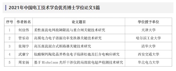为推动我国电气工程领域的科技进步,鼓励创新性研究,促进青年专业人才成长,中国电工技术学会今年首次开展中国电工技术学会优秀博士学位论文推荐与评选工作。获奖人需在攻读博士学位期间,在电气工程及其相关领域的基础理论或应用基础研究中取得重要成果,或在关键技术或应用技术创新等方面成果显著。