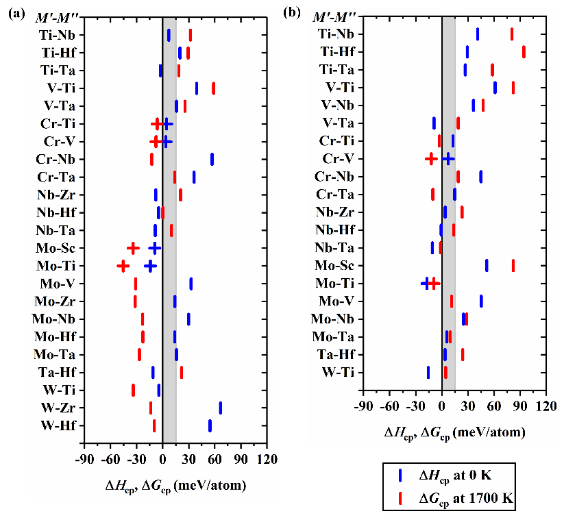 本工作开发了基于第一性原理晶体结构热力学简谐近似模型的高通量线性规划优化算法,针对43种潜在的o-MAX相材料的合成热力学进行了研究。研究结果表明:相比于M'2M"2AlC3型o-MAX结构,M'2M"AlC2型o-MAX更具合成前景,且过高的烧结温度并不利于M'2M"2AlC3型o-MAX相的制备;就反应热力学角度而言,大多数o-MAX相可通过非元素单质粉末冶金方法制得较纯净目标产物;少数o-MAX相(Cr2TaAlC2, Nb2HfAlC2, Nb2TaAlC2, Nb2Hf2AlC3, Nb2Ta2AlC3, Mo2V2AlC3和Mo2Ta2AlC3)或由于典型烧结温度(1700 K)下热力学不稳定或由于竞争反应过于强势难以合成。