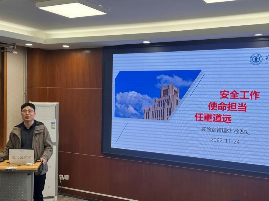 实验室处徐四龙副处长以《安全工作、使命担当、任重道远》为题,分享实验室安全专题报告。报告介绍了国内高校近年来的安全事故案例和防范工作要点。他表示,实验室安全工作要见危于无形,见祸于未萌。建议各系所除指派安全员进行实验室安全管理外,每个实验室应指定一名学生作为具体责任人,抓牢抓细抓实安全工作。实验室所有安全员除参与校级层面的培训外,学院还应组织更有针对性的专业培训,已具备专业级别的实验室管理业务能力。