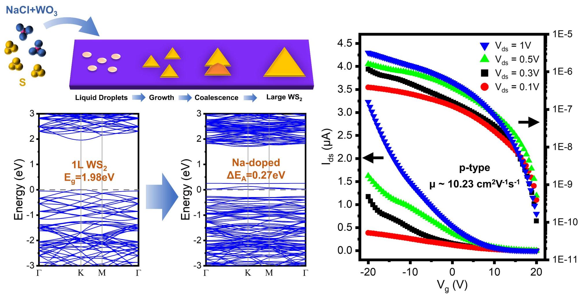 孟国栋副教授课题组与澳大利亚国立大学Zongyou Yin教授课题组开展合作研究,利用氯化钠(NaCl)辅助的气相化学沉积方法,成功实现了P型单层二维二硫化钨的可控生长,并制备了基于二维二硫化钨的P型场效应晶体管。该方法可实现对二硫化钨形貌及尺寸的调控,制备的二硫化钨具有原子级厚度以及优异的荧光特性,测试结果表明场效应晶体管的平均载流子迁移率可达10.23 cm2V-1s-1。结合理论分析和第一性原理计算发现,氯化钠可在生长过程中与前驱物反应生成液滴状中间产物,在加速生长的同时实现了钠原子的掺杂,而钠原子的掺杂引入了新的受主能级,成功实现了对二硫化钨能带结构的有效调控,使其呈现出P型半导体的特性。该研究工作揭示了基于氯化钠辅助气相化学沉积法的二维二硫化钨的合成和能带调控机制,为实现P型二维二硫化钨与互补金属氧化物半导体制作工艺的集成应用提供了新的思路。