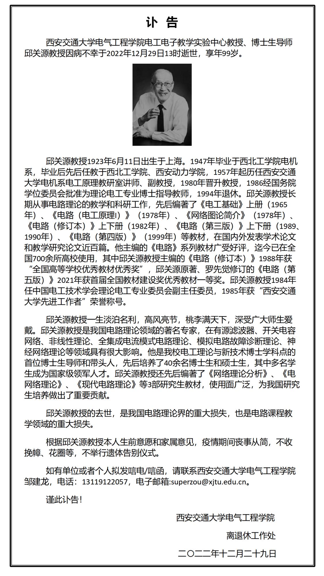 电工电子教学实验中心教授、博士生导师邱关源教授因病不幸于2022年12月29日13时逝世,享年99岁。