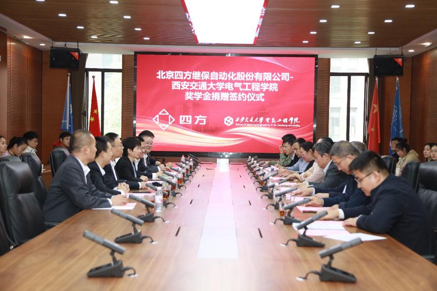 谢勇和赵力代表校企双方签署了奖学金捐赠协议,别朝红为四方股份颁发捐赠铭牌。签约仪式前,参会双方共同参观麻豆在线