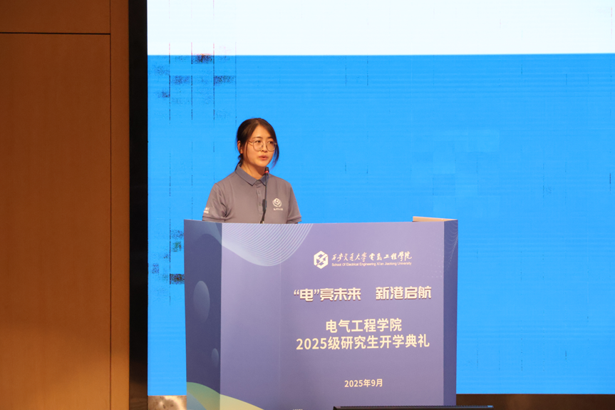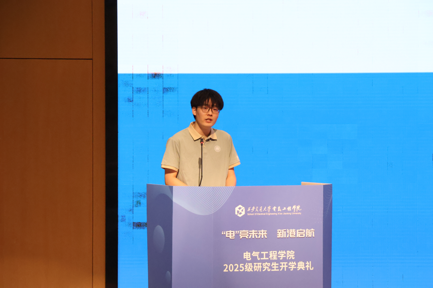 发电教研室2025级硕士研究生王晓彤同学作为新生代表发言。她以一张1956年西迁专列乘车证为引,讲述自己被“向科学进军,建设大西北”精神感召,毅然选择在交大深造的心路历程。她结合骑行川藏线的经历动情说道:“当看到偏远地区一盏盏亮起的电灯,我更加明白,科研的方向必须与时代同频共振。我们研究的不仅是技术,更是责任——点亮山河,温暖人间。”她相信唯有通过静心钻研基础理论,严谨积累,方能厚积薄发。