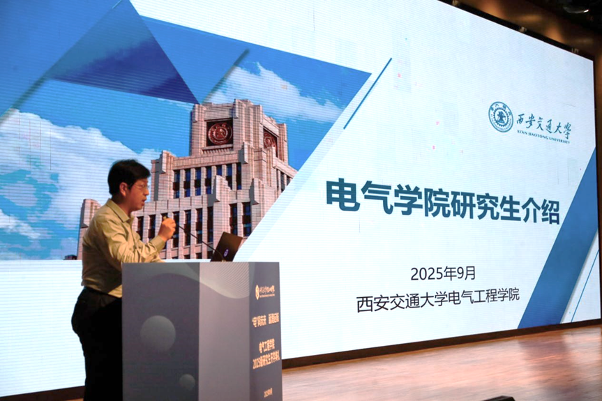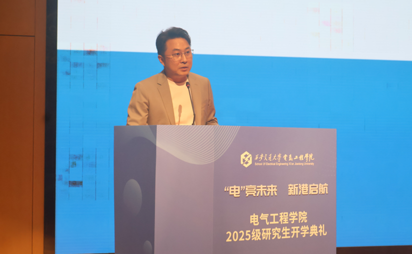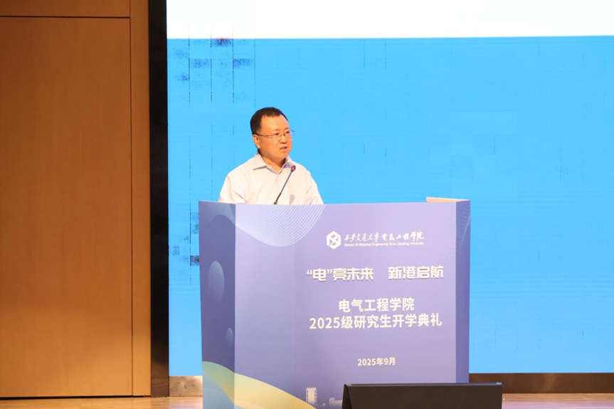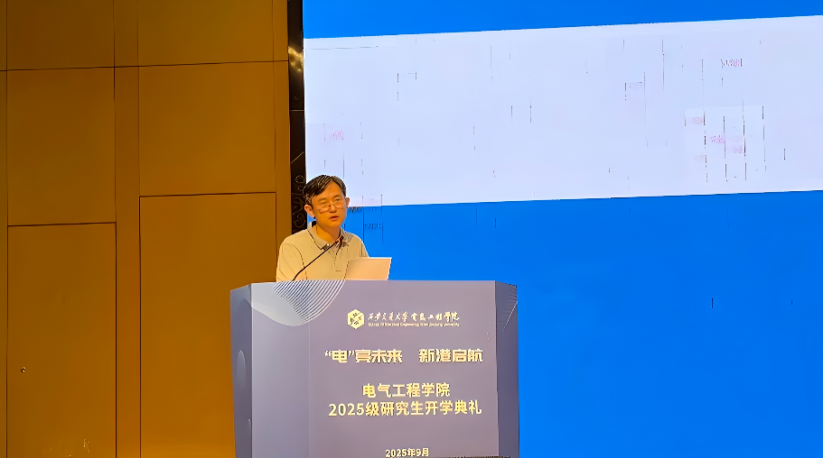 院长杨旭教授回顾了电气学院从南洋公学电机专科至今的百年发展历程,强调学院始终与国家电力事业同频共振,为国家输送了大批杰出人才。他寄语新生:一要敢于抓住机遇。研究生涯短暂,面对稍纵即逝的机会,要主动出击、奋勇争先,在变革中开辟新局;二要提升核心竞争力。面对科研“内卷”,唯有掌握超越他人的能力与智慧,成为不可替代的“少数”,才能真正破局;三要做出超越个人利益的选择。真正重要的抉择,往往不以个人得失为衡量,而应心怀家国,在服务国家战略中实现人生价值。他勉励同学们在创新港这片沃土上,脚踏实地、志存高远,书写属于新一代电气人的精彩篇章。