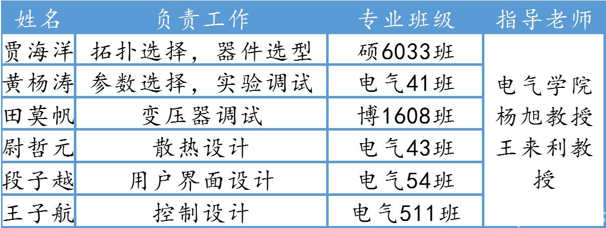为期一年多的设计和准备中,杨旭教授、王来利教授担任指导教师,贾海洋同学负责拓扑选择和器件设计,黄杨涛同学负责参数选择和实验调试,田莫帆同学负责变压器设计,尉哲元同学负责散热设计,段子越同学负责用户界面设计,王子航同学负责控制设计。交大的作品凭借功率密度3.8W/cm3的优异性能和3D打印散热器等独到的创新设计,在全球电力电子的顶尖高校聚集的IFEC2018大赛中一举夺魁。