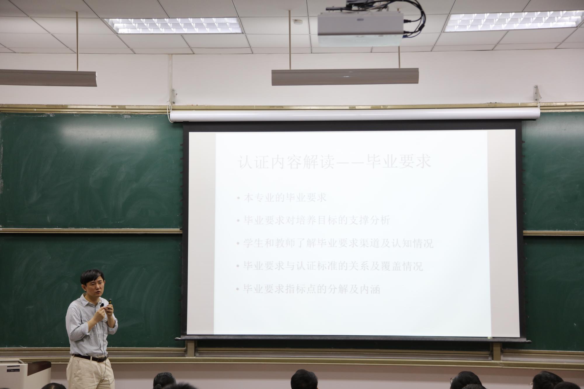 此次专业认证的意义有两点:一是与国际工程教育接轨;二是完成未来教育部三级专业认证体系的最高标准,即国际质量标准认证。会议从人才培养目标的更新、教学理念的变化、教育部政策方向、培养体系的设计理念等方面说明了认证的要求与必要性,对七项认证标准进行了解读,并重点介绍了专业认证理念:首先以学生为中心,从课程设置、教学方法和服务出发,进行一切围绕学生的教育;其次是结果导向(OBE),搞清楚教育的结果是使学生学到了什么;最后强调持续改进,实现课程闭环与专业闭环,改进永远在路上。