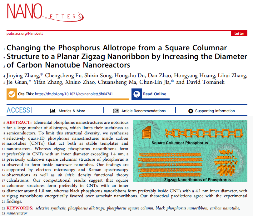 电气学院电力设备电气绝缘国家重点实验室新型储能与能量转换纳米材料研究中心与我校贾春林科学家工作室、东南大学、上海大学和密西根州立大学合作,利用不同内径的碳纳米管作为特殊反应腔可控合成不同的磷的同素异形体结构。在内径约为1.0纳米的碳纳米管内合成新的方形柱状磷结构,而在内径约为4.1纳米的多壁碳纳米管内合成之字型走向的黑磷纳米片结构。该实验结果与我们的理论预测完全吻合,理论预测当截面尺寸小于1.4纳米时,方柱状磷结构是最稳定的,而当截面尺寸大于1.4纳米时,之字型走向的黑磷纳米片结构是最稳定的。相关成果以《增大碳纳米管反应器的直径使方柱状磷结构到之字型走向的黑磷纳米片》“Changing the Phosphorus Allotrope from a Square Columnar Structure to a Planar Zigzag Nanoribbon by Increasing the Diameter of Carbon Nanotube Nanoreactors”为题发表在纳米材料领域顶级期刊《纳米快报》上(影响因子12.279)。麻豆在线