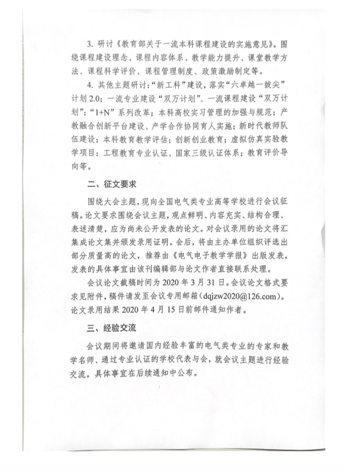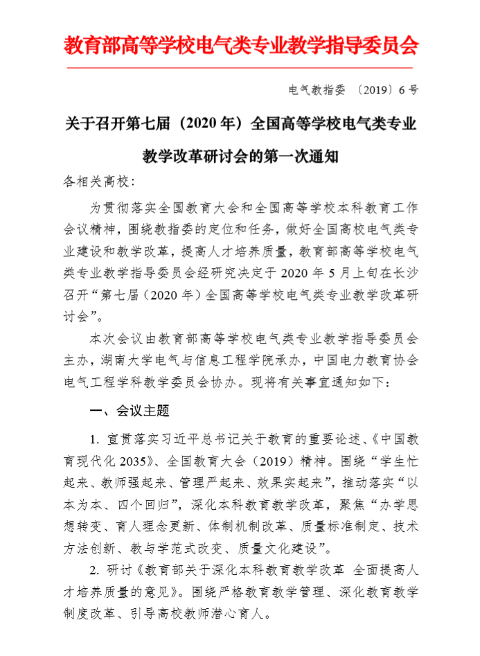 教育部高等学校电气类专业教学指导委员会主办,中国电力教育协会电气工程学科教学委员会协办的第七届(2020 年)全国高等学校电气类专业教学改革研讨会开始征文了,欢迎各位老师投稿参会,具体通知请见附件!