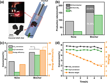 孟国栋教授课题组提出了一种通过协同大气压辉光放电(APGD)等离子体与生物炭高效转化CO2和H2O为合成气的创新思路,在大流量(2000 mL/min)和高H2O含量(50%)下实现了23.6%的能量效率、5.7%的CO2转化率和5.1%H2O转化率,显著提升了CO2-H2O的等离子体转化性能;同时构建了考虑生物炭表面反应的反应动力学模型,揭示了等离子体辅助CO2-H2O转化的反应路径及等离子体与生物炭之间的协同作用机制,发现在等离子体射流区域生物炭与OH和O自由基的反应,排除了生物炭与CO2、H2O和O2等气体分子反应的可能;发现生物炭的表面反应是CO2和H2O转化率提升的关键,生物炭与OH和O自由基反应并抑制产物的复合反应,从而显著提高CO2和H2O的转化率,以缓解H2O的淬灭作用。从生命周期的角度来看,该方法可以利用水、工业烟气中的二氧化碳和废弃资源中的生物炭来产生合成气,而合成气是碳氢化合物合成的基本前驱体。因此,该方法提供了一条面向碳循环和能量转换的绿色可持续途径。