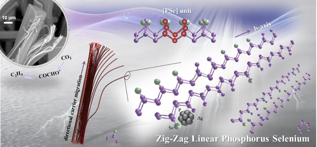 、电工材料电气绝缘全国重点实验室张锦英教授团队成功制备了硒原子替代的一维锯齿状磷同素异形体并实现了高选择性光还原CO2制乙烯。通过熔融硒法成功合成出由硒掺杂的锯齿状走向的一维磷组成的单晶结构,通过单晶X射线衍射技术解析了其晶体结构为P18.56Se1.44(Pnma,CSD-2348033)),并结合所有可能的原子替代结构的热力学稳定性相图计算精确解析了其中硒原子的替代模式。研究发现P18.56Se1.44的富硒晶面(-10-1)能够显著增强CO2吸附和C-C偶联以获得C2H4,在不使用空穴牺牲剂的情况下产率为18.0 μmol g-1h-1(C2H4的电子选择性为97.0%),高于目前报道的绝大多数光催化剂。结合原位漫反射红外傅里叶变换、原位X射线光电子能谱、CO还原实验和密度泛函理论计算等方法,发现光电子能有效地从硒和银助催化剂转移到磷,证实了P18.56Se1.44的电子局域化效应在促进CO2吸附与碳-碳耦合中的作用。