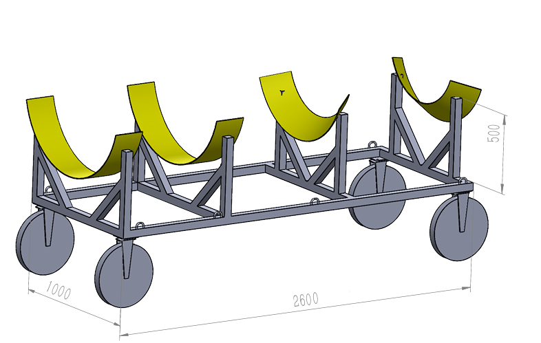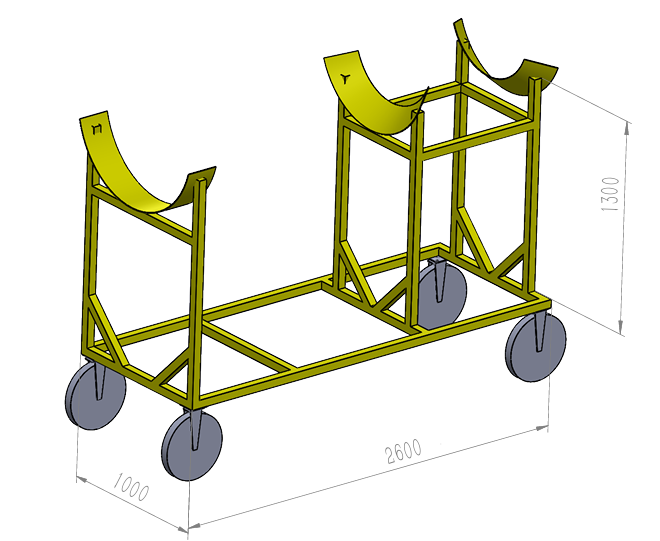 ⑤脉冲源运输底座:根据采购方设计图纸要求,完成800kV高压脉冲源运输底座机械加工。加工与800kV高压脉冲源相匹配马鞍支座外形尺寸为200×1321×505,马鞍弧度R为505,设计尺寸为2600×1100带刹车万向轮,用于主体支撑。要求底座运输承载重量不低于5吨,静态承载重量不低于10吨且与脉冲源紧密贴合安装牢固可靠。底座满载质心高度≤1500mm。⑤见图2。