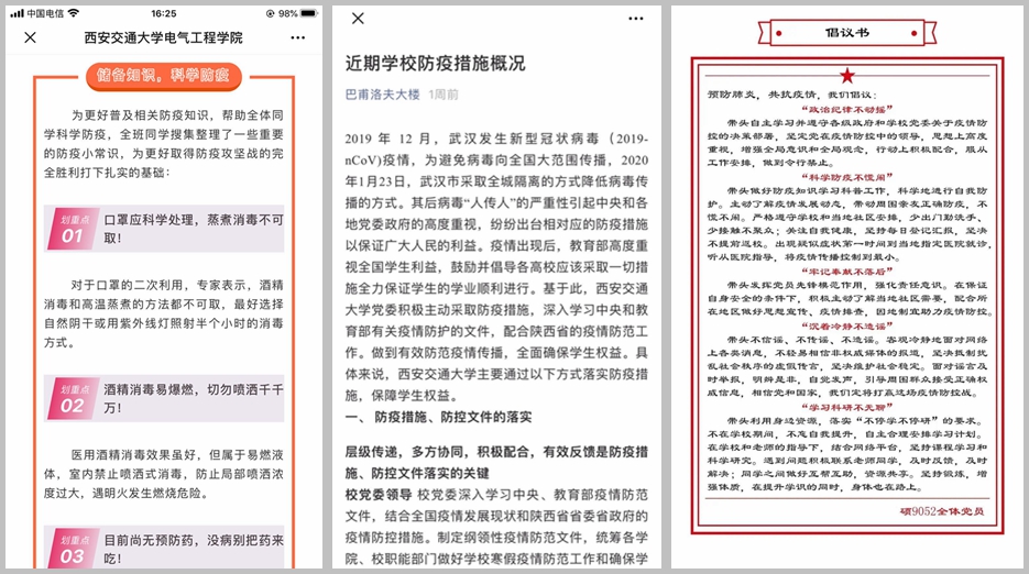 疫情期间,湖北和武汉的局势牵动人心,电气学院各研究生党支部在疫情期间严守政治底线,做好调查研究,通过线上加油接力、支部倡议等方式为湖北加油;通过社交网络对谣言进行辟谣,营造积极正面舆论环境。硕8048党支部动员全体成员根据官方发布信息,每日在班级群里发布疫情形势;硕9053党支部整合防疫知识,集中发布,助力同学科学防疫;硕9041党支部梁仓通过个人公众号发布学校近期防疫状况和时事评论;硕9052党支部就党员如何发挥先锋模范作用提出五点倡议,号召全体党员亮明身份,做好表率。各支部也对开学后防控疫情可能出现的情况进行了讨论,认为开学后不能掉以轻心,要对个人、公共场所消毒工作高度重视,在疫情完全过去之前,减少非必要聚集活动。