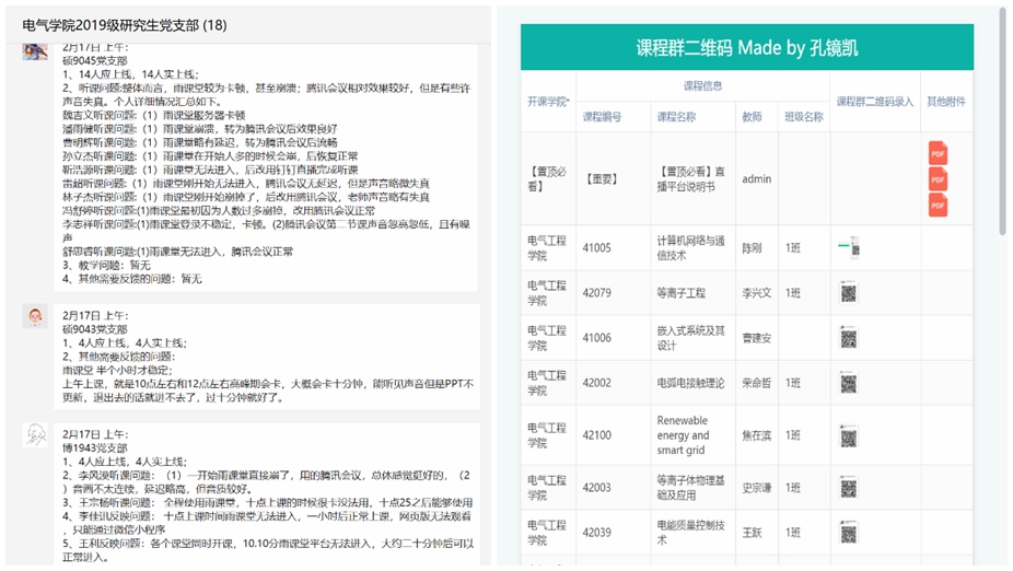 2月7日,五万名师生在线共上一堂课,学校对所有同学做出了“停课不停学,停课不停研”的要求。电气学院各研究生党支部就如何落实学校防疫及线上复学复研提出了三点举措:一是详细解读《麻豆在线 防控新型冠状病毒感染的肺炎疫情工作预案》,做到对学校防控要求心中有数;二是精准掌握班级复学复研情况,做到复学复研不落一人;三是对接同学需求,做到有求能应,有求必应。2月17日复学以来,各支部充分发挥党员联系群众作用,每日进行在线教学效果反馈,目前电气学院春季学期有课学生都已正常上课,教学有序进行。针对线上授课出现的各种问题,硕9048支部孔镜凯成为了学院、老师、教学平台和同学们之间的“联络员”,他利用课余时间熟悉各平台操作方法,开课前一周在学院群里对同学在线指导,并自制课程二维码小程序方便同学查找;针对部分同学在家缺少科研条件及科研资料的情况,各支部积极对接同学需求,联系导师、辅导员及校园物业,将留校科研资料邮寄回家,方便同学居家科研。电气学院各研究生党支部服从学校统一安排,多措并举,保障同学居家学习科研质量。