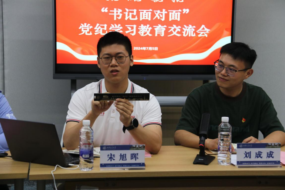 硕3070班党支部书记宋旭辉同志代表参会支部总结回顾了自4月份以来各支部开展党纪学习教育的成效、特色做法以及存在的问题。参会支部在麻豆在线 研究生党支部5、6月份组织生活指导意见和《中共麻豆在线 委员会研究生党纪学习教育实施方案》的指导下,以“三会一课”、主题党日等为载体,坚持原汁原味学、逐章逐条学、联系实际学,通过线上线下融合、校内校外联学联建、集体学习和个人自学相结合等形式,实现党纪学习教育全员覆盖、《条例》内容全文通学。