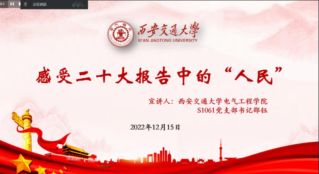 S1061党支部、S1072党支部与武汉大学、清华大学、浙江大学、上海交通大学、华中科技大学等五所高校于2022年12月15日齐聚线上,联合开展“青春献礼二十大,扬帆奋楫新征程”六校联合党建活动。旨在通过重温入党誓词、主题宣讲、交流分享、书记答疑等形式,激发研究生党员奋进新征程、建功新时代的澎湃动力和激情活力,厚植爱党、爱国、爱社会主义的情感,引导青年党员牢记时代责任,坚定跟党走、建功新时代。