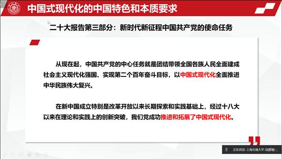 上海交通大学段常坤以《深刻领会中国式现代化的中国特色和本质要求》为题作分享,他以中国式现代化的中国特色和本质要求为核心,阐述了中国式现代化的内容在整体布局中所处的重要位置,并结合二十大报告原文对中国式现代化与其他国家现代化的共同特征和中国特色进行解读与分析。