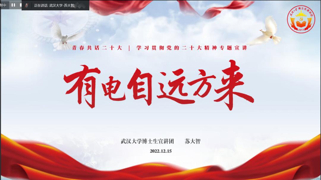 武汉大学苏大智以《有电自远方来》为题作分享,他围绕党的二十大报告中对深入推进能源革命提出的要求,指出电力现代化事关国际民生,是能源高质量发展中的重要一环,并从我国特高压事业发展的前世今生出发,讲述了中国式现代化的深刻内涵与新时代建设者的责任担当。
