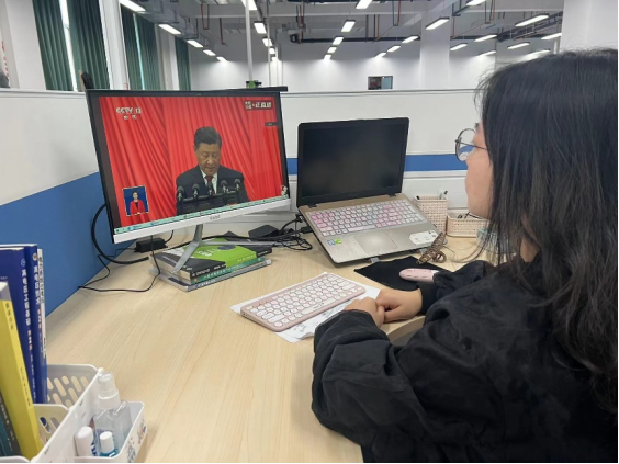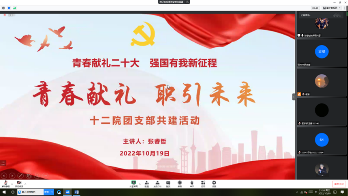 喜迎二十大,接力青年人。团支部组织观看新闻联播“喜迎二十大”系列报道,支部成员认真收看,摘录分析报告金句。团支书杨章汇总收集各团小组摘抄金句40余条,并为大家逐句解读。