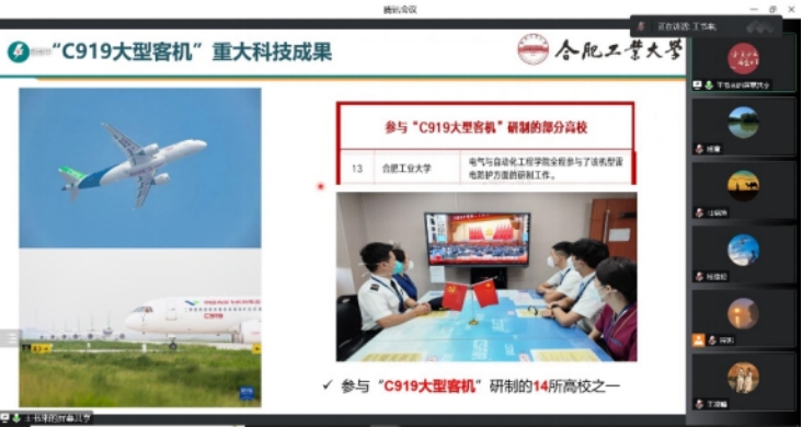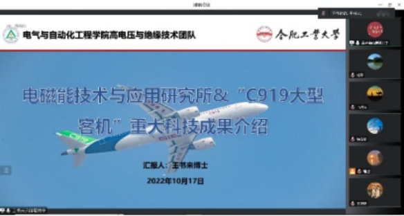 云聚线上览国之重器,共促高压学科齐腾飞。硕2076团支部邀请合肥工业大学高压团队进行线上跨校高电压学科交流会,博士王书来集中介绍展示“C919大型客机”的科技成果,讲述段泽民教授课题组突破重重壁垒,经过近20年的努力拼搏,攻克飞机全机雷电电磁瞬态效应评估难题,填补国内空白的事迹。王书来表示,将在未来继续寻求和把握合作交流的机会,共同促进高电压技术学科的发展。