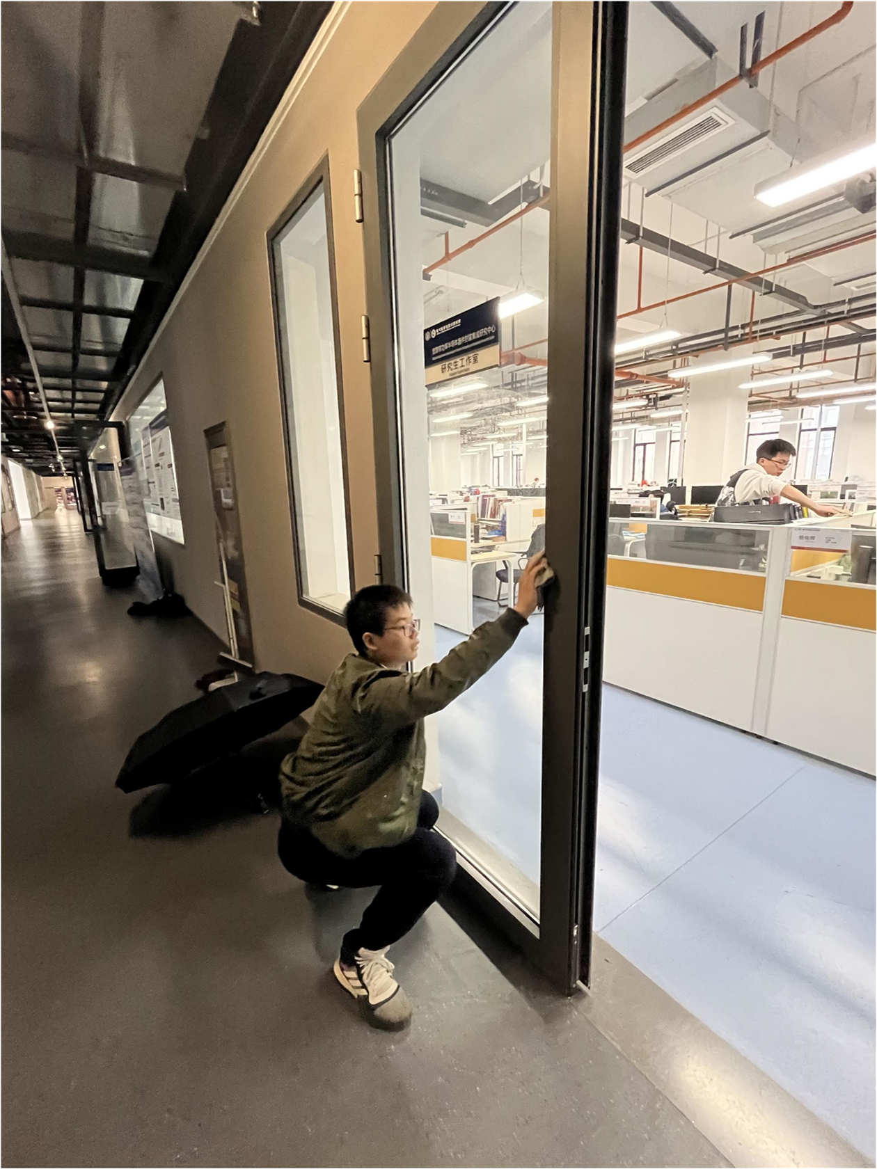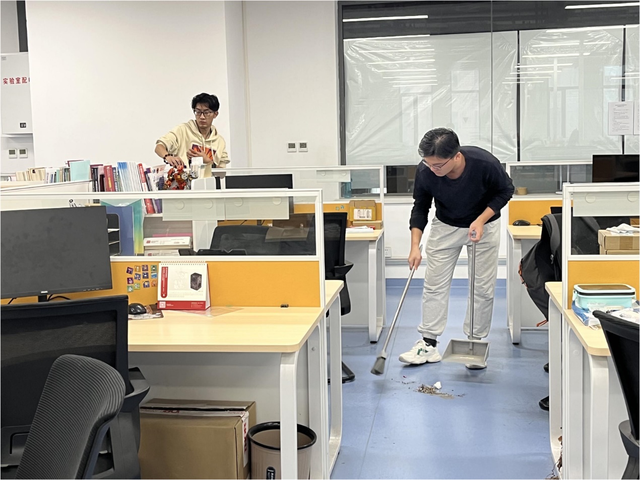 同学们在尽量不打扰师生工作学习的条件下,来到本支部负责的三号巨构宽禁带器件与封装集成研究中心,首先根据公共区域分布和教研室工位摆放对在场同学进行任务分配,其次利用手头工具开始清理和打扫工作。