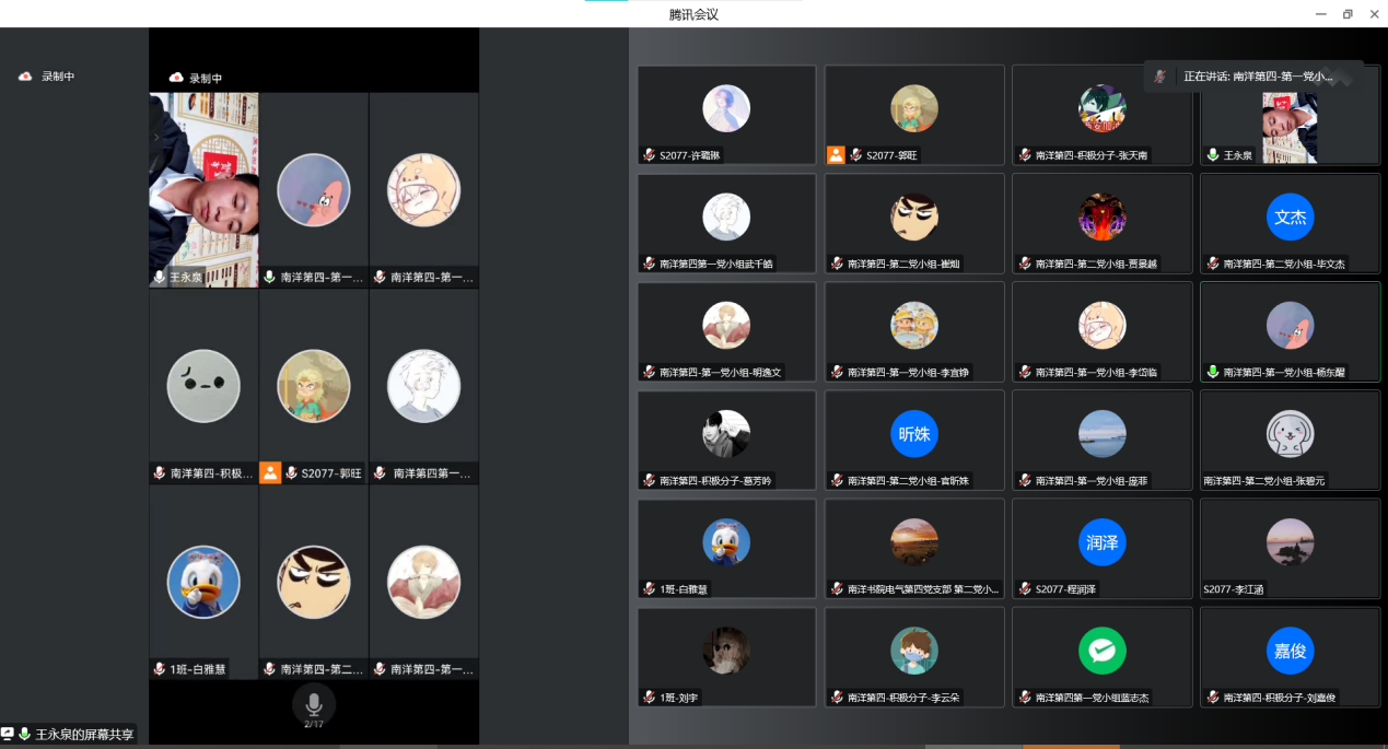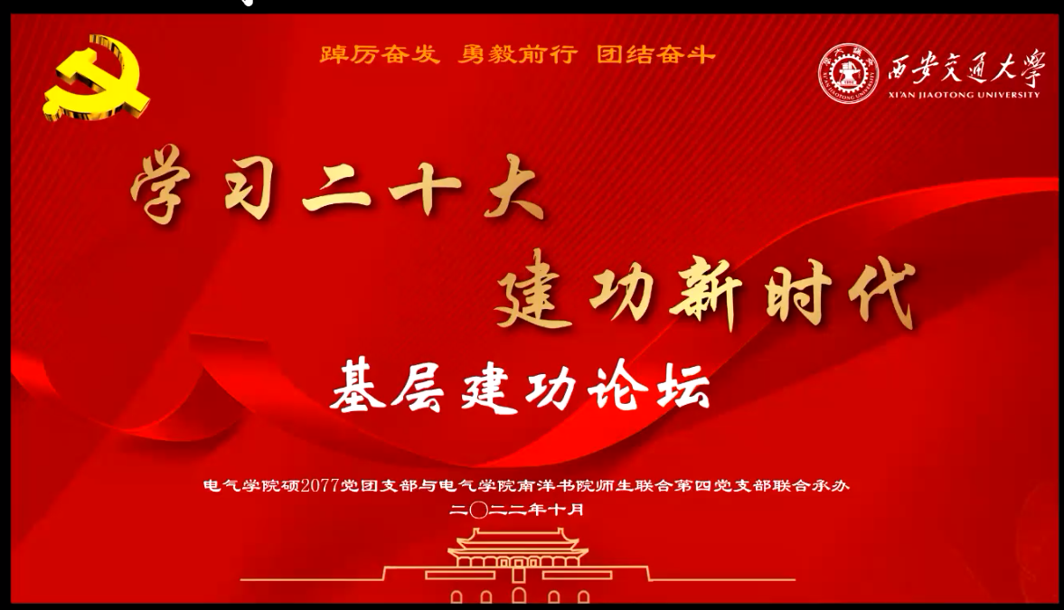 为庆祝党的二十大胜利召开,加强同学们基层服务意识,10月16日下午,电气学院硕2077党团支部与电气学院南洋书院师生联合第四党支部积极响应党委号召,在线上举办了以“学习二十大,建功新时代”为主题的基层建功论坛,邀请第二届“人民公仆”养成行动学员参会。本次论坛聚焦于学习领会党的二十大重要精神,邀请了基层选调生校友王永泉分享基层工作情况与感悟,硕2077党支部书记郭旺同志主持本次论坛。