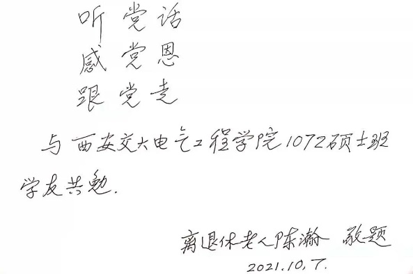 李露怀着激动的心情和崇高的敬意说道,陈教授提到最多的是党给他的关怀与帮助,我从中深切的感受到他对党的无限感激。党的一句“建设大西北”,他就义无反顾、心甘情愿开始西迁!听党话,跟党走准没错!去年习近平总书记来到交大看望老教授们,王树国校长也曾登门拜访,他的学生也经常来看望他,有喜讯也会电话给他,陈教授都感到非常高兴与感激。最让我震撼与钦佩的是,陈教授九十二岁高龄,背已佝偻,还坚持独自居住,房屋简朴而宁静,并且每天亲自打扫房间,自己做饭......太多感悟一时说不尽。总之,这三个小时是发人深思、深入人心的一课。陈教授马上就要去广州和孩子一起生活了,不知以后是否还能亲耳听老人家讲那些生动有趣的故事,衷心希望他一直身体健康,继续见证祖国和新一代青年人更多更大的辉煌成就!