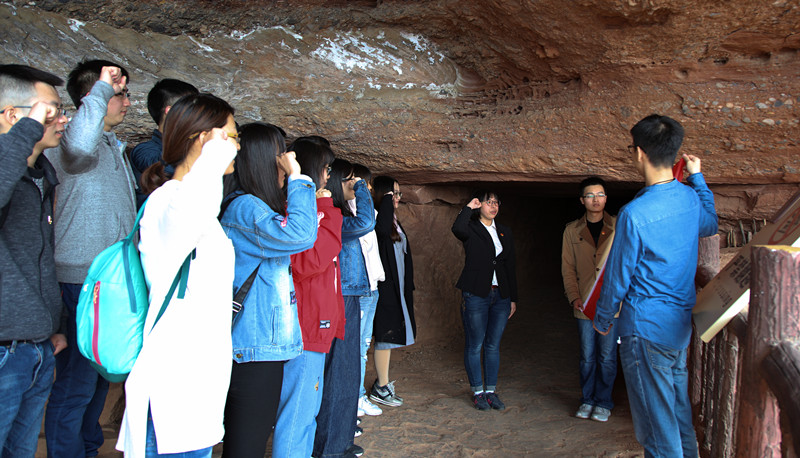 实践队首站来到了薛家寨红军革命教育基地。革命时期,红军利用山顶天然岩洞修建了指挥部、医院、修械所、被服所等寨洞,使之成为陕甘边革命根据地的政治、军事中心和红军游击队的后方基地。