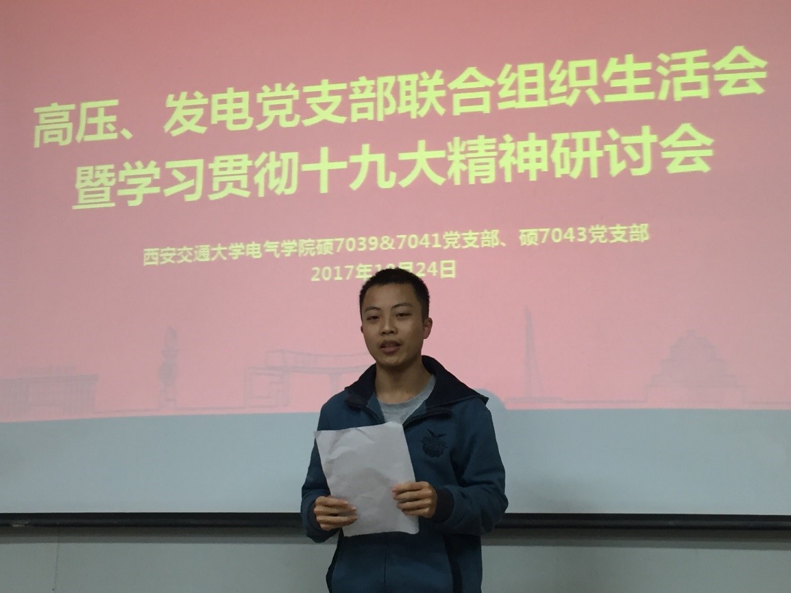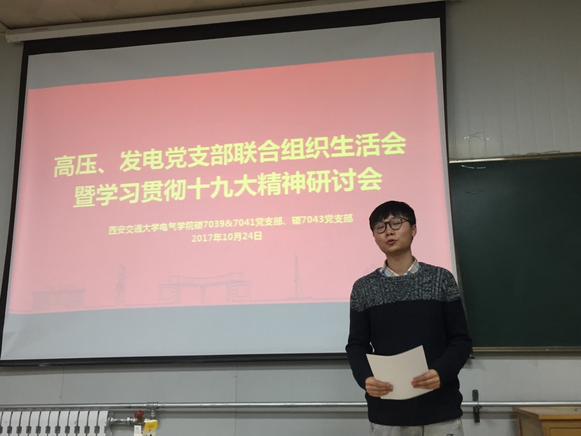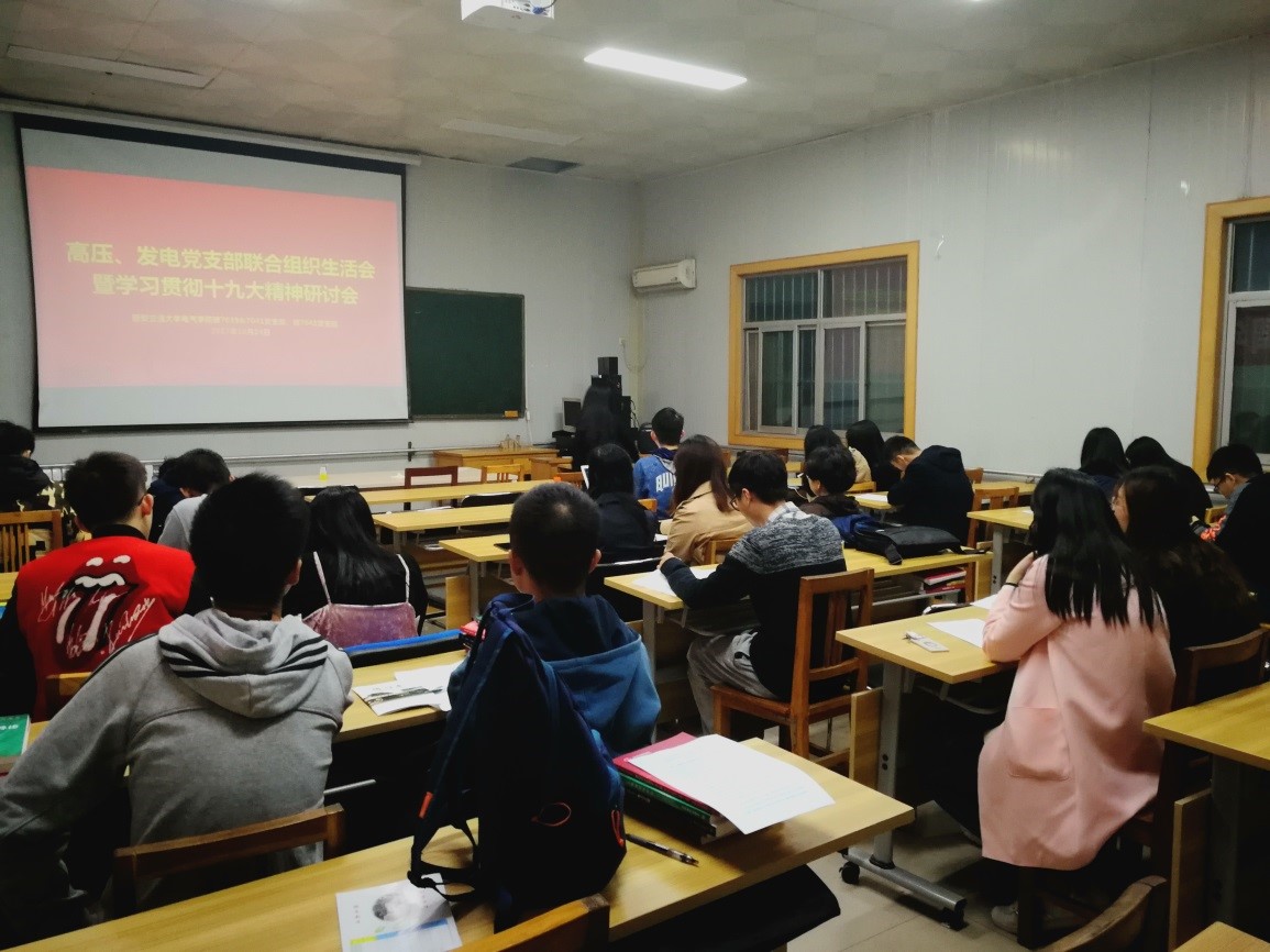 2017年10月24日晚,硕7039/41班党支部和7043班党支部在高电压技术教研室联合举行了主题为“学习贯彻十九大精神”的组织生活会。