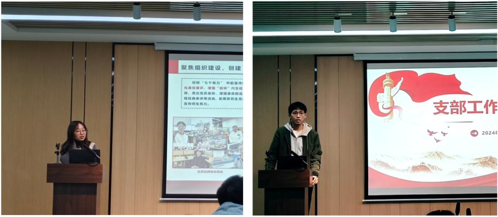 首先是党支部工作经验交流。电气学院硕3065党支部创新打造“匠心蓄能”型党支部,支部书记周雅雯介绍两个“创新”,一是学习内容创新,依托关键节点开展“铭记九一八”等专题学习,突出重点、深化内涵;二是活动形式创新,打造“奋斗·青年”品牌,增强组织凝聚力。生命学院硕3124班党支部着力将党支部建成坚强堡垒,支部书记全文彬分享具体做法,在日常工作中注重理论学习与实践结合,鼓励党员在科研、社会服务等方面发挥先锋作用,通过党员带动身边同学在各方面积极追求卓越,勇攀学术高峰。