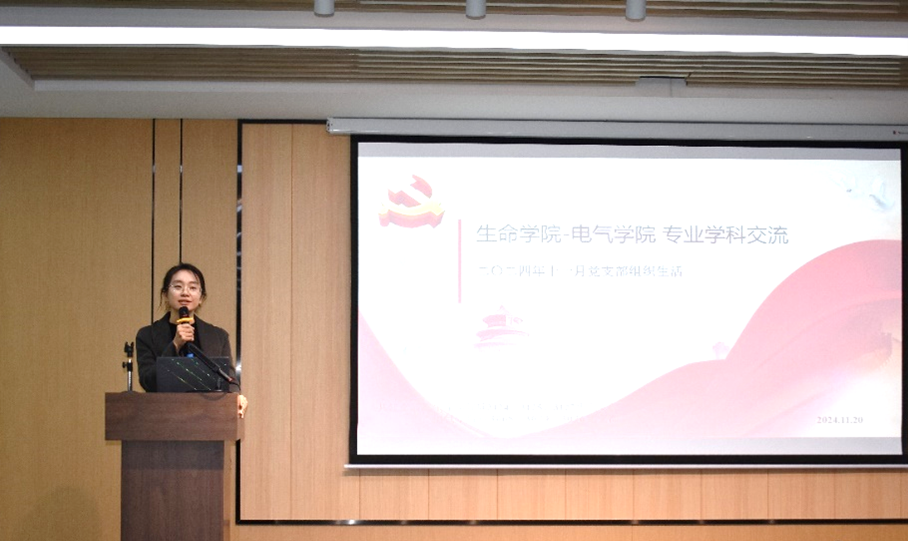 在专业和学科发展交流环节,两院党支部代表纷纷热烈交流。电气学院硕3070党支部肖举栋介绍了电气学院的发展历史、科研平台与标志性研究成果,分析了学院在技术研发、成果转化及行业影响力方面的显著优势,展示了电气学院在服务国家能源战略和推动产业创新中的重要作用。生命学院硕3126班党支部刘俊铎做题为《可穿戴超声贴片用于无创肺动脉高压监测》的分享,探讨了该技术在临床上的潜力与挑战。刘俊铎表示,跨学科交流可以促进两院同学的思想碰撞,激发出新的创意。