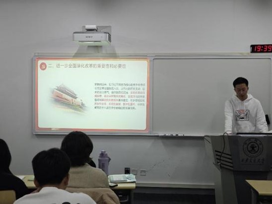 首先,李嘉哲同学总结了党的二十届三中全会的主要内容,分享了会议学习心得。会议指出要以经济体制改革为核心,推动全面创新体制机制,统筹经济与各领域改革,以及发展与安全协调推进,强调改革开放在中国式现代化中的重要性,突出“七大聚焦”全面深化改革。同时,李嘉哲同学回顾了中国经济发展历程,我们历经筚路蓝缕、改革开放,中国的发展迎来了新时代。青年同志应当立志高远,精勤求学,勇于担当,为中国的发展添砖加瓦。