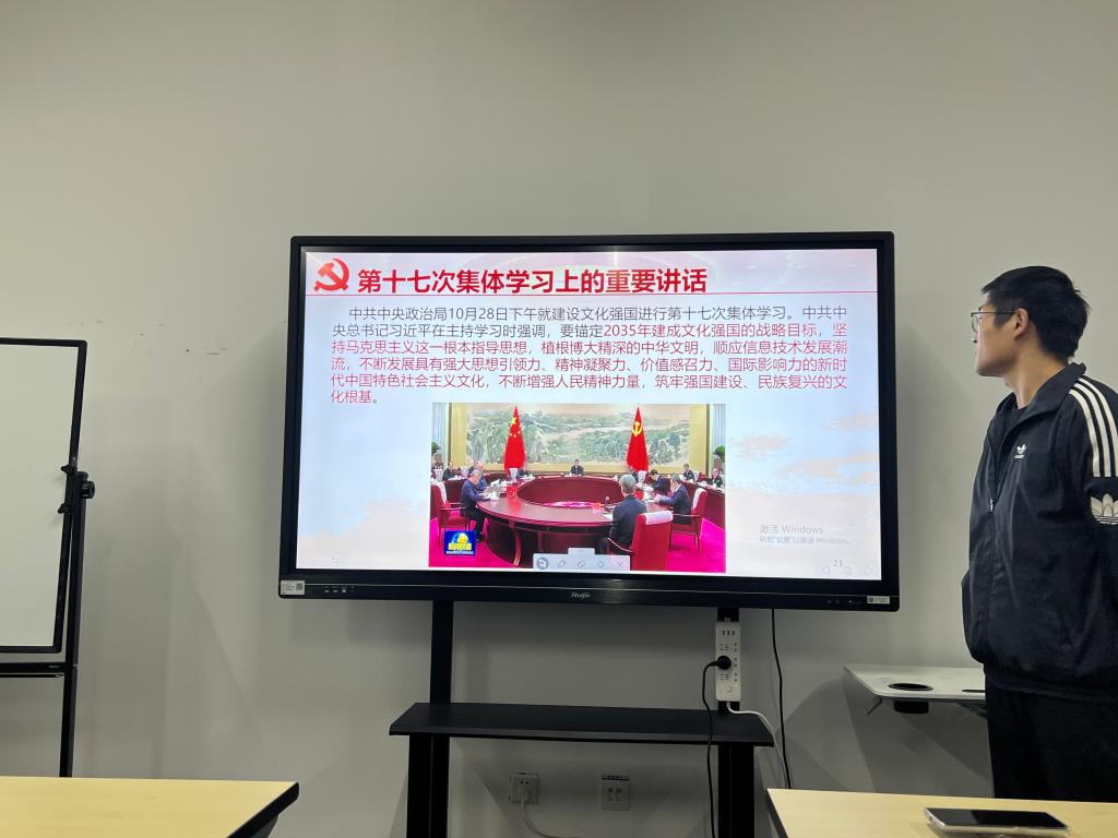 毛晓朋带领大家深入解读了习近平总书记在二十届中共中央政治局第十七次集体学习上的重要讲话精神。要坚定不移走中国特色社会主义文化发展道路,要着力激发全民族文化创新创造活力。通过分享四川阿坝的文化扶贫和国产游戏走向世界的案例,生动展现了中华文化的深厚底蕴与时代魅力。最后,鼓励同学们增强对中华文化的认同感和自信心,为提升国家文化软实力与影响力贡献青春力量。