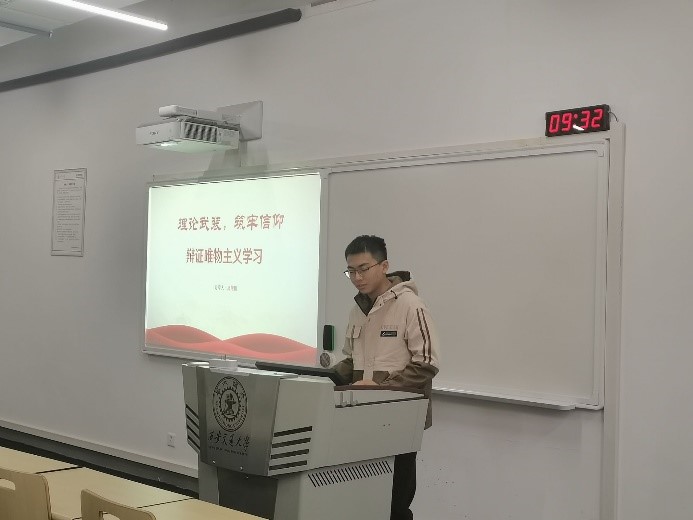 赵喾同学在听完分享后表示:通过这次学习,我对辨证唯物主义有了更深的认识。辨证唯物主义揭示了事物发展的根本原因在于事物内部的矛盾性,事物矛盾双方又统一又斗争,促使事物不断地由低级向高级发展。辨证唯物主义思想对于我们的日常科研学习生活也有着重要的指导作用。勇担使命葆初心,砥砺奋进新征程,日后我将继续努力学习,巩固自己的理论知识水平,用理论指导实践,砥砺前行,为世界之光。