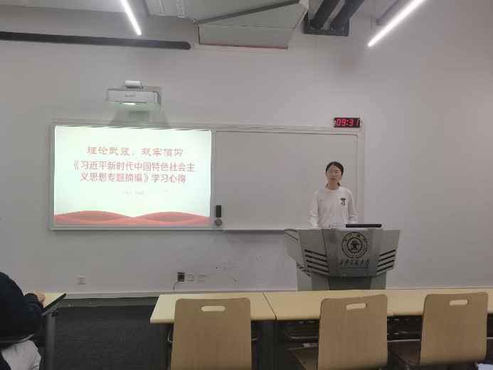 活动伊始,团支部书记高婉婧同学分享了近期自己学习《习近平新时代中国特色社会主义思想专题摘编》的学习心得。分享主要围绕书籍的主要内容和核心思想展开,并从核心思想中的“坚持和发展中国特色社会主义”,“全面深化改革”,“坚持以人民为中心的发展思想”,“全面依法治国依规治党”,“实现高水平科技自立自强”,“构建人类命运共同体”六个方面,详细介绍了自己的学习过程以及心得体会。最后,高婉婧同学立志继续加强理论学习,坚定理想信念,同时呼吁团支部成员一同加强理论学习,在科研中贡献自己的力量,努力为国家的科技自立自强贡献力量。