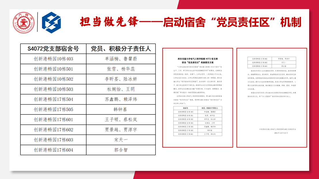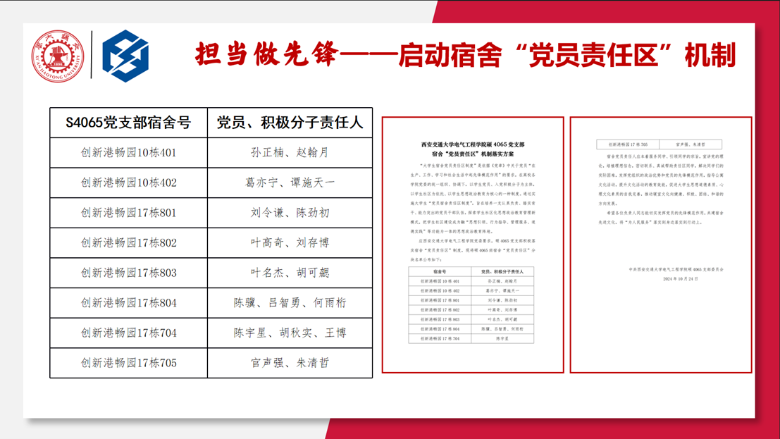习近平总书记在全国高等学校党的建设工作会议上强调了基层党组织在推动发展、服务群众、凝聚人心、促进和谐中的重要作用。为响应号召,积极配合学院党委推进党建工作,硕4065党支部和硕4072党支部启动宿舍“党员责任区”机制,硕4065党支部书记胡可勰宣读公布设置的18个“党员责任区”宿舍,及其党员责任人。充分利用学生公寓的优势,搭建的党员开展宣传服务工作新平台,将增强学生党员的自我教育、自我管理和自我服务能力,提高思想政治教育的实效性。宿舍“党员责任区”机制相关落实方案也于活动后在两个班级班群集进行公示,加强群众监督。