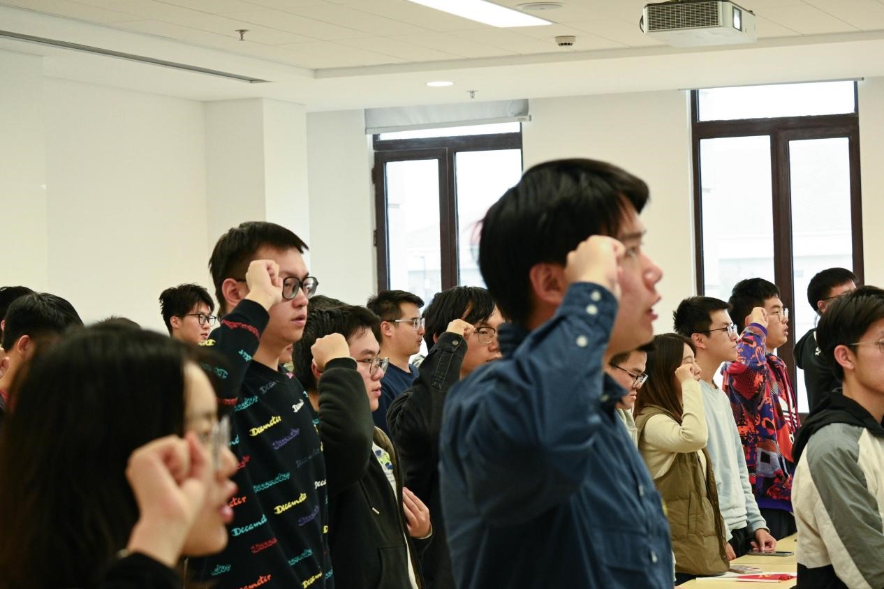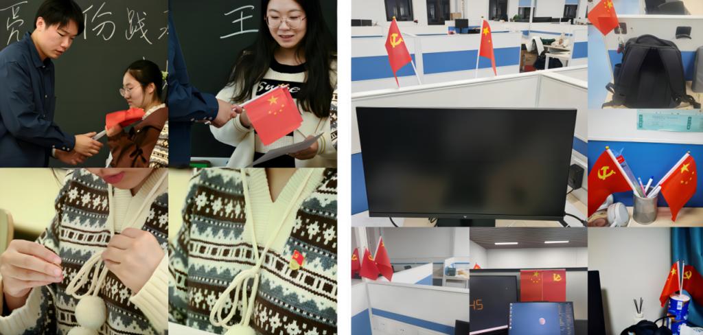 为了引导党员在生活区、科研学习区以身作则、率先垂范、奉献担当,学院要求学生党员在宿舍区教学区主动亮明身份,担当责任。在本次主题党日活动中,硕4065、硕4072党支部举行身份卡牌、旗帜党徽颁发仪式。硕4072党支部书记李昕荃同志、硕4065党支部组织委员朱清哲同志代表两个支部为每位党员发放党旗、国旗、党徽,并强调了党徽的正确佩戴方法。