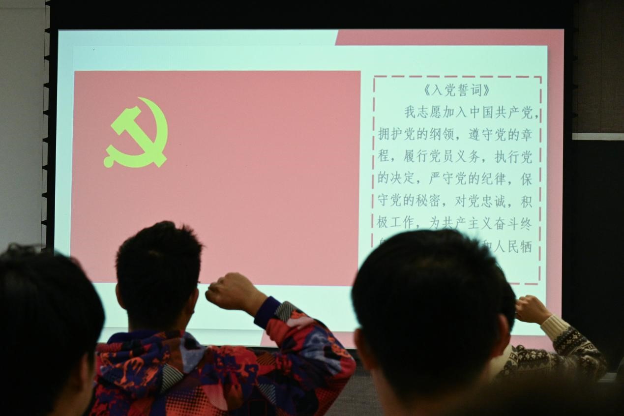 全体党员同志正确佩戴好党徽后,在鲜红的党旗下,庄严地举起右手,握拳宣誓,重温入党誓词,铭记庄严的承诺,牢记共产党员的政治责任、学生党员担当和光荣使命,以更加饱满的热情投身到组织生活中,切实发挥好共产党员的先锋模范作用。