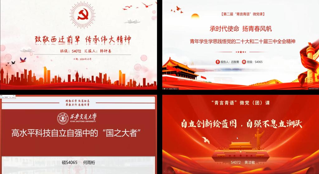 为进一步学习贯彻习近平新时代中国特色社会主义思想,进一步加强基层党组织建设和党员的思想教育工作,硕4064、硕4072党支部积极组织电气学院第二届“青言青语”微党课比赛预赛。本次比赛共吸引了两支部12名同志参与其中,围绕中国式现代化推进中华民族伟大复兴这一主题,结合自身学习、科研经历,分享了对习近平新时代中国特色社会主义思想的理解与感悟,探讨了青年学生如何践行党的二十大精神,讲述了高水平科技自立自强背后的故事,以及西迁精神对当代青年的意义。活动激发了同学们的爱国情怀和社会责任感,加深对党的光辉历程和伟大成就的了解,提升其党性修养和个人表达等综合能力。