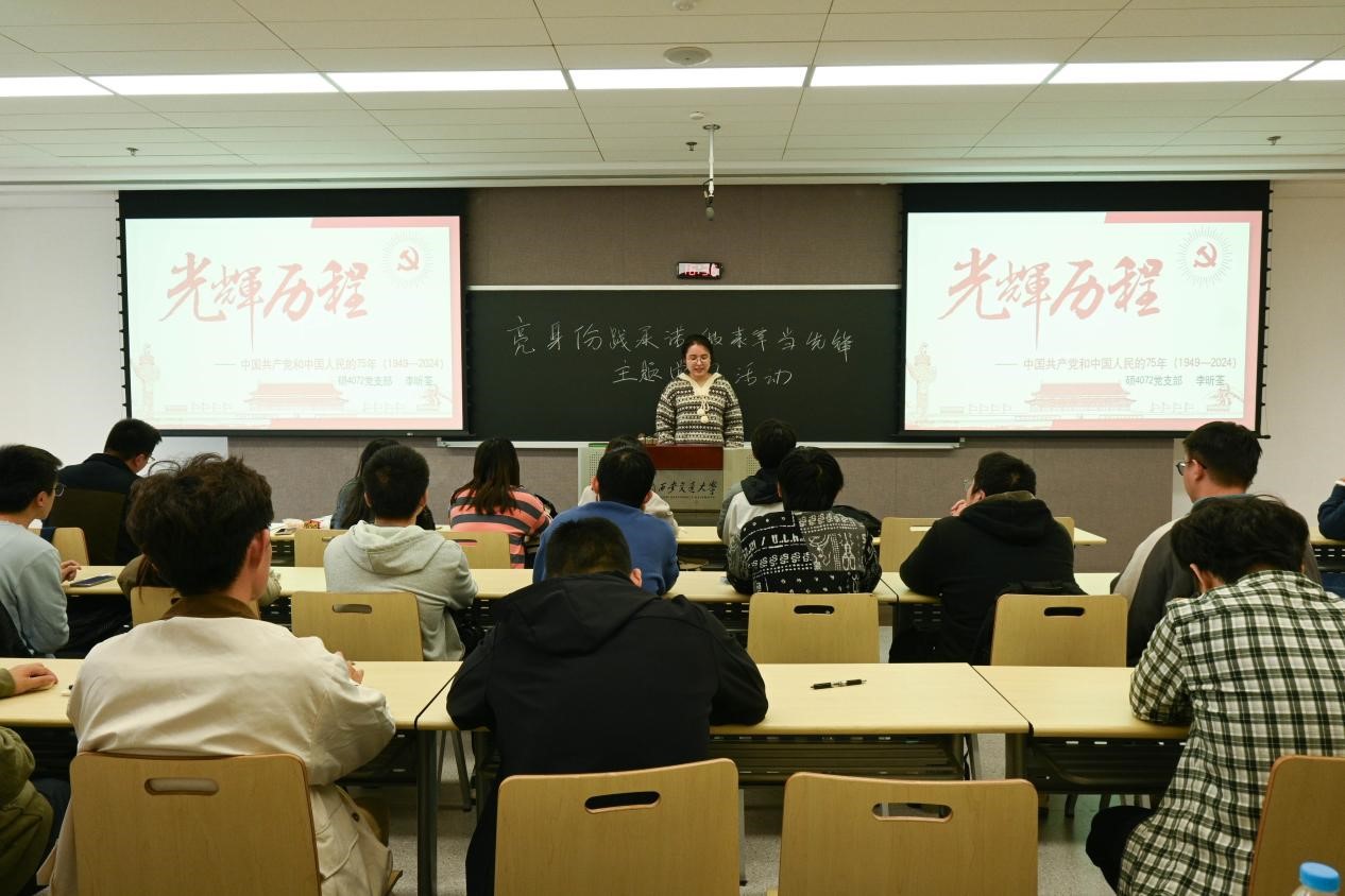 为持续提升党员同志、入党积极分子政治素养,增强爱国情怀,硕4072党支部书记李昕荃同志讲述“中国共产党与中国人民的七十五年征”主题党课,带领党员们深入学习了党的光辉历程,从社会主义革命和建设时期,到改革开放和社会主义现代化建设新时期,再到中国特色社会主义进入新时代,全面回顾了党领导人民取得的辉煌成就。