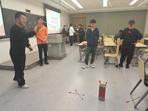 随后,同学们纷纷离开座位,亲身参与到“文化小游戏”中,深入体会传统文化。飞花令中同学们分为两队,从《诗经》到《尚书》,从唐宋到元明清,头脑风暴,引经据典,在感悟诗词之趣的同时,也了解了古人的饮酒艺术与聪明才智。