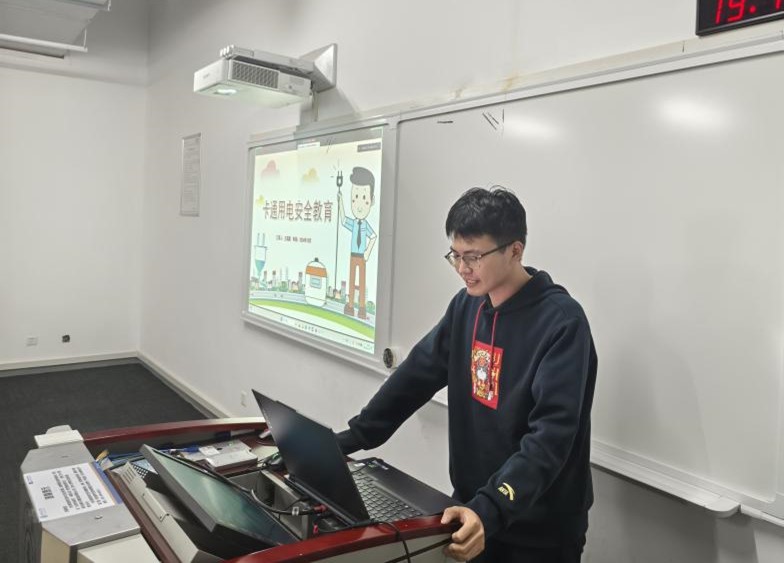 随后,硕4063团支部的王瑞晨同志为小学生们带来了一场精彩的“用电安全小课堂”。他通过科普动画引入,简明扼要地介绍了电能的基本概念、产生、传输及应用,帮助小学生们建立起对电的初步认识。接着,王瑞晨同志结合日常生活场景,详细讲解了触电、短路、火灾等用电安全隐患,并着重强调了应对这些突发状况的正确方法。通过一系列生动的讲解和互动,小学生们不仅深刻认识到安全用电的重要性,还掌握了日常用电中必须注意的安全事项。