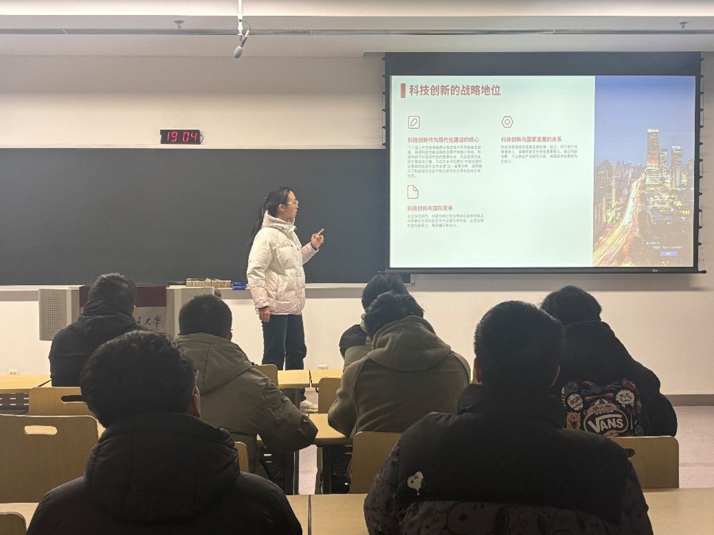 科技创新与国家现代化。郭俊佑同学聚焦党的二十届三中全会中关于科技创新的重要论述进行分享,科技创新是国家发展的核心动力,必须深化科技体制改革,提升自主创新能力,尤其在人工智能、量子科技、生命科学等前沿领域取得突破。通过讲解和讨论,大家认识到,科技创新不仅是国家现代化的重要支撑,而且对推动经济高质量发展具有决定性作用。特别是在当前全球科技竞争日益激烈的背景下,中国如何通过科技创新实现经济结构转型升级、建设数字经济新型产业等问题,引发了大家的热烈讨论。同学们认为,作为新时代的青年,我们不仅要具备创新意识,还要在实践中增强创新能力,积极投身到国家的科技创新和现代化建设中,贡献自己的智慧和力量。