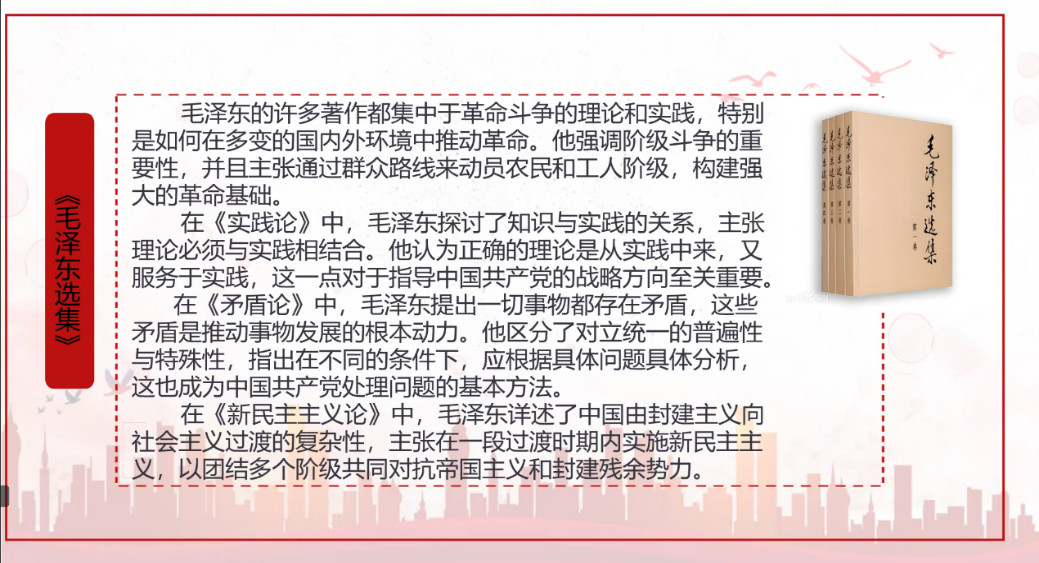 最后,活动以读书分享会的方式结束。来自电气2307团支部的吴佰峻同志推荐了《钢铁是怎样炼成的》、《毛泽东选集》两本书目。他通过分享两本红色经典的内容梗概与中心思想,介绍保尔柯察金的铁人精神、毛泽东同志的经典论述与政治远见,让同学们对两本书有了初步的了解,激发了同学们阅读红色经典的热情。